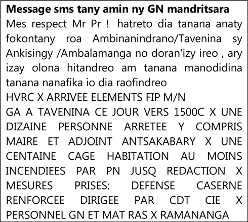 Tension. En tout cas, cette affaire risque de renforcer la tension entre la Gendarmerie et la Police nationale. Dans un message transmis au Procureur, la Gendarmerie de Mandritsara confirme que « ce sont les policiers qui ont mis le feu sur les habitations des villageois » (ndlr : voir la copie du texto à l’article par ailleurs). « Arrivés à Tavenina vers 15 heures, des éléments de la Force d’Intervention de la Police de Mahajanga ont arrêté une dizaine de personnes dont le Maire et l’Adjoint au Maire d’Antakabary. Une centaine de cases d’habitation, au moins, a été incendiée par la Police nationale jusqu’à cet instant où nous écrivons cette rédaction ». C’est ce qui est écrit dans ce rapport de la Gendarmerie nationale transmis au Procureur de Mandritsara et reçu hier par la présidente du Syndicat des Magistrats de Madagascar, Fanirisoa Ernaivo. Les policiers auraient également arrêté tous les villageois qui ont croisé leur route. Le District de Befandriana Nord étant sous très haute tension suite à cette affaire, les hauts responsables au niveau de la Gendarmerie ont ordonné le renforcement de la défense de la caserne de la Gendarmerie locale.