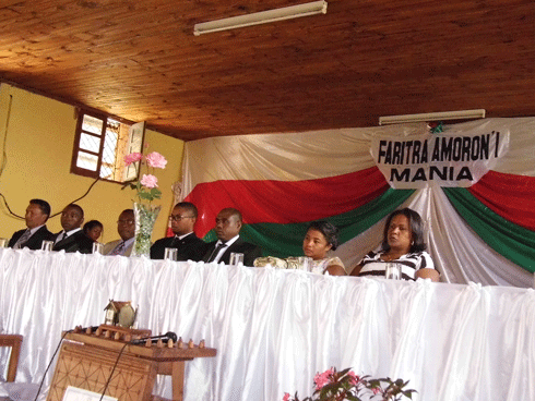 « La préfète d’Ambositra, Ravakiniaina Randrianaivo (extrême droite) et le chef de région d’Amoron’i Mania, Joël Ramanakiafarana (3e à partir de la droite). (Photo Anastase)