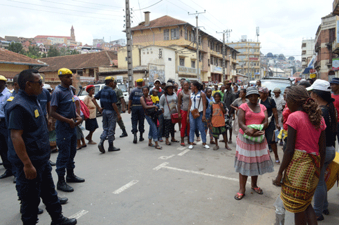 Raikitra ny sakoroka tetsy Analakely omaly maraina. Teo ankilany, ny polisin’ny kaominina, andaniny, ireo mpivarotra amoron-dàlana izay voalaza fa mbola nitokona tsy nety niala. Vokany olona efatra no nosamborina. Niha-ratsy ny fandehan-javatra tamin’izay satria tsy nanaiky ireo mpivarotra ary nitaky ny hamoahana tsy misy atakandro ireo olona ireo izay nentina tany amin’ny birao. Nitangorona marobe nanoloana ny biraon’ny kaominina ny rehetra. Voalazan’ny vaovao fa nisy polisy avy ao amin’ny kaominina iray voasambotry ny olona ary saika hanaovana fitsaram-bahoaka. Tsy nahatosika intsony ireo polisy kaominaly ka niantso ireo polisy avy ao amin’ny boriroritany voalohany sy ny avy ao Tsaralalana. Hita fa tsy ampy ireo rehetra ireo ka tonga koa ny Emmo Reg nanampy. Fantatra koa fa nisy ny tora-bato avy amin’ireo olona maro nitangorona izay tsy nety niparitaka. Farany nalefa ny grenady. Avy eo nisy ny fifampiresahana, araka ny vaovao voaray teny an-toerana. Taorian’izany, navotsotra avokoa ireo efatra nosamborina.
