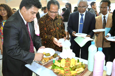 A l’occasion de cet événement, le chargé d’affaires en pied de l’Ambassade d’Indonésie, Artanto S WARGADINATA a fait un exposé intitulé «Diplomatie-Gastronomie : Une réflexion sur l’identité nationale et les Diversités Culturelles ». Pendant la présentation, le Chargé d’Affaires a martelé l’atout important sur l’emplacement stratégique de l’Indonésie (grand archipel dans le monde), l’unité dans la diversité, les 30 différents types alimentaires de l’Archipel (y compris le Nasi Tumpeng qui joue un rôle très important dans l’histoire, la philosophie, la culture et le paysage du pays). Un moyen pour faire connaître au public les opérateurs en gastronomie de l’Indonésie, à savoir l’Association Gastronomique Indonésienne (IGA). A travers les Associations des Femmes Indonésiennes à Madagascar (DWP), les plats Indonésiens ont été au menu, comme le Kue Lumpur (gateau), Nagasari Yogyakarta, Lumpia Semarang et les produits à base de soja (Jus, lait, fromage…). Un alumni Indonesia de l’IEP parlant couramment le bahasa Indonesia a demandé une clarification sur le slogan indonésien « Unité dans la Diversité ». Une opportunité pour la délégation indonésienne de promouvoir la 3e édition de Rakibolana Indonesia – Malagasy. Un projet d’ouverture d’un restaurant indonésien à Madagascar est aussi au menu pendant le débat.