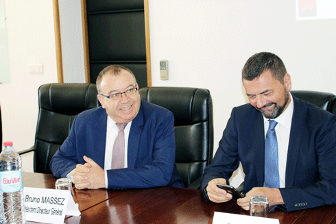 Bruno Massez (à gauche) le PDG de la BFV-SG, lors de la présentation des résultats financiers intermédiaires de la banque, hier à Antaninarenina
