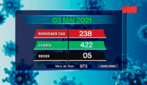 Par ailleurs, 238 nouveaux cas ont été enregistrés en 24h, sur 973 tests effectués. La région Analamanga compte toujours le plus grand nombre de cas avec 165 nouvelles contaminations le lundi 3 mai : Antananarivo Renivohitra 105; Ambohidratrimo 23; Antananarivo Atsimondrano 30; Antananarivo Avaradrano 7. Actuellement, 3733 personnes sont en cours de traitement, dont 308 cas graves. Quant aux guérisons, elles sont au nombre de 422, observées dans dix régions.
