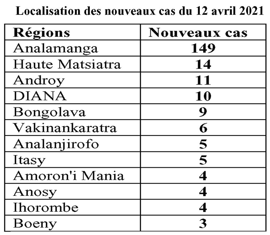 224 nouveaux cas de Covid-19 sur 800 tests effectués, ont été enregistrés le 12 avril 2021 selon le bilan quotidien du CCO diffusé, hier, sur la chaîne de télévision nationale. Soit un taux de positivité de 28%, nettement moins que les jours précédents où les taux de positivité sur plusieurs jours successifs avoisinaient les 37 % à quasiment 40% (39,9%). La majorité des nouveaux cas du 12 avril est toujours localisée dans la région Analamanga, comptant 149 cas, dont 91 à Antananarivo Renivohitra ; 16 à Ambohidratrimo ; 30 dans le district d’Antananarivo Atsimondrano et 12 dans celui d’Antananarivo Avaradrano. Actuellement, 3837 personnes sont en cours de traitement dont 288 cas graves.