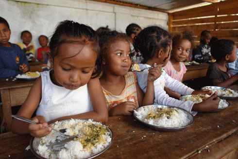 Les cantines dans les écoles ont pendant longtemps été mises en place et gérées principalement par des associations, ONG ou autres organisations œuvrant dans le social et ne concernent qu’un nombre très restreint d’établissements. En revanche, le programme d’alimentation scolaire mis en œuvre de manière plus étendue auprès des écoles primaires publiques (EPP) de certaines localités par le Programme Alimentaire Mondial (PAM) touche des centaines de milliers d’élèves dans les districts les plus touchés par le problème d’insécurité alimentaire et de pauvreté, dans trois districts du Sud et dans les zones défavorisées de la capitale, de Toamasina et de Toliara. Les cantines scolaires sont, en effet, un moyen qui a fait ses preuves pour maintenir les enfants à l’école et améliorer les performances scolaires. Du fait de la pauvreté et de l’insécurité alimentaire, de nombreux écoliers partent à l’école le ventre vide et ont des difficultés pour se concentrer, ou s’endorment en classe. D’autres sont contraints à abandonner l’école. L’alimentation scolaire reste alors un des meilleurs moyens d’éviter toutes ces entraves.