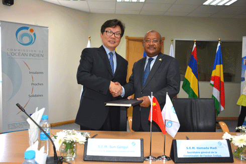 Observateur auprès de la Commission de l’Océan Indien (COI) depuis 2012, la Chine appuie régulièrement la COI et vient de réitérer son soutien à la coopération régionale à travers un nouveau don de 100 000 dollars. L’accord de don a été signé le 31 octobre dernier entre l’ambassadeur de la République populaire de Chine à Maurice, Sun Gongyi et le Secrétaire général de la COI, Madi Hamada. « La COI est devenue aujourd’hui une organisation régionale de plus en plus importante qui jouera à l’avenir un rôle de plus en plus grand dans les affaires régionales et internationales », devait déclarer à cette occasion l’ambassadeur Gongyi. Pour sa part, le SG de la COI a affirmé que ce soutien renouvelé de la Chine témoigne de l’intérêt de ce pays aux enjeux du développement dans la région de Océan Indien et de l’appréciation positive que porte la Chine sur l’action de la COI. Et à lui de faire part de son souhait de voir en cet accord un prélude à une coopération renforcée de la Chine avec l’organisation afin de faire face ensemble aux grands défis du développement qui se posent aux Etats insulaires de l’Océan Indien et qui influent sur la stabilité à long terme de la région. L’ambassadeur Gongyi est allé dans le même sens en déclarant la Chine prête à continuer à travailler avec la COI pour mettre en œuvre des projets concrets et contribuer au développement des pays membres de la COI.