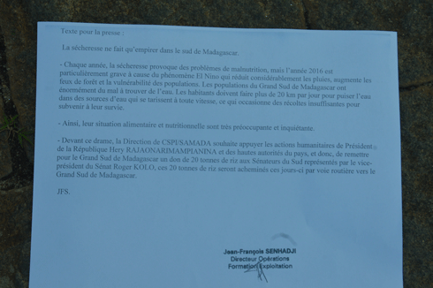 Face à la précarité de la situation alimentaire et nutritionnelle dans le Grand Sud du pays, le CSPI/SAMADA se mobilise à travers la réalisation d’une action humanitaire. Ainsi, 20 tonnes de riz ont été remis entre les mains des sénateurs du Sud, hier. Ces derniers étaient représentés par le vice-président du Sénat, Roger Kolo. La remise des dons a eu lieu à Mandrosoa Ivato. Tous ces sacs de riz seront alors acheminés au plus vite dans les endroits les plus vulnérables au kere, par voie routière. En effet, cette initiative du CSPI/SAMADA est motivée par sa constatation d’une situation d’urgence dans le Grand Sud. «La sécheresse ne fait qu’empirer dans le Sud de Madagascar. Et chaque année, elle provoque des problèmes de malnutrition. Pour 2016, le kere est particulièrement grave à cause du phénomène El Niño qui réduit considérablement les pluies, et augmente en même temps les feux de forêt et la vulnérabilité des populations. Du coup, elles ont énormément du mal à subvenir à leurs besoins fondamentaux, surtout en matière de vivres. Beaucoup parcourent des kilomètres rien que pour trouver des sources d’eau. Ce qui occasionne des récoltes très insuffisantes pour toutes les populations. Nous n’avons donc apporté que notre part de briques afin d’aider les populations vulnérables», a déclaré le porte-parole du donateur lors de la remise des dons.