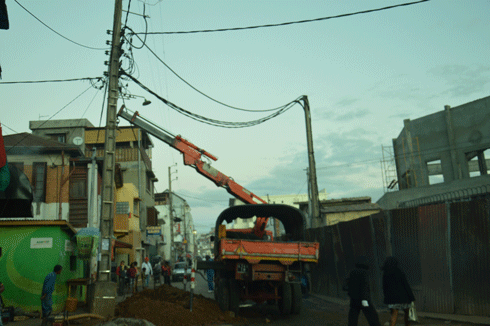 Une buse endommagée sous un grand poteau à Behoririka menace d’entraîner l’effondrement de celui-ci. Heureusement que la Jirama a aussitôt commencé les réparations pour éviter un danger public. Notons que ce poteau comporte des circuits électriques qui alimentent plusieurs maisons aux alentours. Son effondrement pourrait donc causer d’énormes dégâts, sans compter les dangers liés aux branchements électriques endommagés. Comme montré sur la photo, la Jirama a immobilisé l’un de ses camions près dudit poteau, pour jouer un rôle de support.