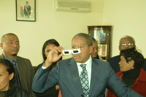 Roland Ratsiraka : Sensibilisation sur le port des lunettes spéciales. Mahajanga, Maevatanàna, Amparafaravola, Toamasina, et Ambatondrazaka. Ce sont les endroits qui permettent d’avoir la meilleure vue de l’éclipse annulaire du soleil, le phénomène astronomique tant attendu qui se produit ce jour, à partir de 10h 45mn. C’est selon le ministre du Tourisme, Roland Ratsiraka, lors d’un point de presse hier, à Tsimbazaza. Une occasion pour lui de renforcer les campagnes de sensibilisation sur le port des lunettes spéciales pour tous ceux qui vont prendre part à ce phénomène extraordinaire. «Le gouvernement malgache a déjà fait des efforts pour que tous les compatriotes puissent profiter du spectacle. Cependant, nous devons reconnaître que les lunettes ne suffisent toujours pas, car non seulement elles sont chères, mais sont également peu nombreuses. De ce fait, il faut se donner la main pour que tout le monde puisse en profiter», dit le ministre. Il a ainsi donné quelques indications sur la répartition de la visibilité de l’éclipse à Madagascar: 90% à Tana, 90% à Antsiranana et 50% à Tuléar. A noter qu’une longue queue a été visible sur presque tous les points de vente des lunettes spéciales à Tana, hier, depuis le début d’après-midi.