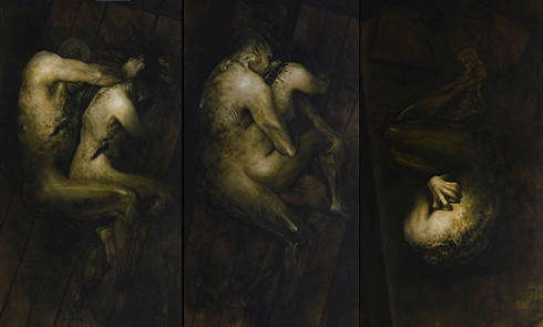 « Des corps, et encore des corps, à hauteur d’homme, que l’on croirait sortis d’un mauvais cauchemar, où la couleur et la forme ne font qu’une. Ces derniers, méconnaissables, véhiculent leur expression souvent inquiétante dans une sorte d’énergie instable, engendrant tout un tas de douleurs extrêmes qui en sont le moteur. L’artiste néglige volontairement la frontière entre la réalité et le fantasme. Un univers dérangeant où, çà et là, on y trouve des corps décapités, lacérés, l’épine dorsale mise en évidence, parfois comme fendue. Des corps si puissants aux carnations féminines dont on ne voit jamais les sexes, soulignant une identification des plus ambiguës. Ils représentent un être tantôt seul, tantôt avec parfois une autre personne de même sexe, brisant cette norme fixe impérative et traditionnelle du couple homme / femme. Il ou elle, indistinctement, le fantasme semble remonter à un temps de la vie où la différence des sexes était inconnue. Les voici enlacés, entre dominant et dominé, ouverts aux prises et aux morsures et qui, hélas, nous ressemblent. Si la peinture de notre artiste est gestuelle, l’écriture nerveuse s’applique malgré tout à se rapprocher de la perfection. Le grand Caravage refait surface, avec cet emploi pertinent du clair-obscur, lui qui en fut l’inventeur, et d’où découle chez Sandjay Liladhar une unité tonale entre des monochromies noires, grises, ocres, qui dominent et attirent le regard. Résurgence d’images interdites à l’Éros exacerbé, autodestructeur, délivrées de tout marqueur social, sans être obscènes ». Cette description qui est celle de Patrick Maradene retranscrit parfaitement les tableaux de Sandjay Liladhar, exposé à l’Is’art galerie Ampasanimalo depuis le début du mois.