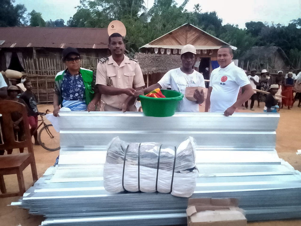 Lors de la distribution des tôles et des clous dans le Sud-Est par, la fondation Axian.
