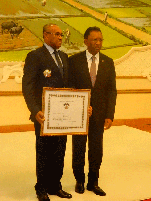 Le beau monde du sport malgache s’est retrouvé hier après-midi au Palais d’Etat d’Iavoloha pour honorer l’un des leurs. Membres du gouvernement, sénateurs, présidents de fédérations, membres au sein de la fédération malgache de football ont honoré de leur présence la cérémonie de décoration du président de la Confédération Africaine de Football (CAF), Ahmad, présidée par le Chef d’Etat, Hery Rajaonarimampianina, hier. « Votre élection à la tête de la CAF est un honneur pour le pays. Le sport malgache ces derniers temps ne cesse de faire connaître le pays au plus haut niveau. Après les exploits sportifs de 2016, déjà en ce début d’année vous nous avez apporté cette bonne nouvelle » a déclaré le président de la République, fier du parcours de son ancien ministre. A cette occasion, Ahmad a été élevé au grade de Grand Officier de l’Ordre National suite à cette élection, pour témoigner de la reconnaissance de l’Etat. Ahmad, ancien président de la FMF a gravi tous les échelons en étant enseignant au sein du CEG, Lycée, entraîneur, directeur de cabinet, pour enfin devenir ministre et sénateur. « Ma victoire est le fruit de la solidarité et le travail de beaucoup de personnes dont vous monsieur le président à travers les lobbying. Je vais essayer de porter avec les honneurs les couleurs malgaches dans mes actions » a expliqué le nouveau président de CAF dans sa prise de parole. Le monde du ballon rond attend beaucoup de l’élection de l’un des leurs au sein de l’instance du football africain.