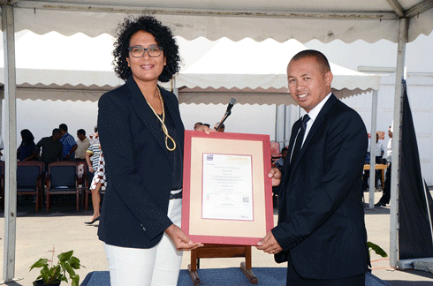 De gauche à droite : Stéphanie Chaléon-Raghoonauth, Directrice d’AFNOR Océan-Indien ; Ny Riana Raharimanjato, Président Directeur Général de GASYPLAST.