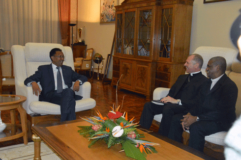 De hauts dirigeants de l’Eglise Catholique Apostolique Romaine (ECAR) à Madagascar, composés notamment de Monseigneur Paulo Rocco Gualtieri, nonce apostolique à Madagascar, Monseigneur Désiré Tsarahazana, président de la Conférence Episcopale de Madagascar (CEM), Monseigneur Marie Fabien Raharilamboniaina, vice-président de la CEM et Monseigneur Jean-Claude Randrianarisoa SG de la CEM, ont rencontré le président Hery Rajaonarimampianina, hier en fin d’après-midi, à Iavoloha. Selon le nonce apostolique, cette rencontre a surtout été focalisée sur la célébration du 50e anniversaire de la relation entre le Saint siège (Vatican) et Madagascar. Il n’a pas manqué de souligner que l’Eglise catholique est très présente dans le pays, à travers notamment l’éducation et la santé. Il se pourrait que d’autres sujets ont été abordés même si ces dirigeants ont dit que 50e anniversaire a été le seul sujet discuté.