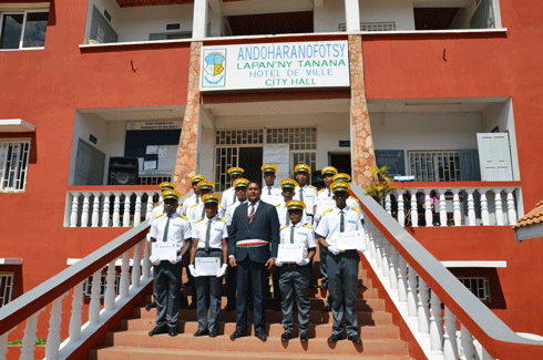 Polisy kaominaly miisa 14 no navoaka tamin’ny fomba ofisialy tao amin’ny Kaominina Andoharanofotsy ny 24 aogositra teo, teo ambany fitarihan’ny Ben’ny Tanàna tao an-toerana. Tany am-boalohany dia niisa 30 mianadahy izy ireo, araka ny fankatoavana sy fanapahana avy tamin’ny Filankevitra kaominaly, saingy rehefa avy nandalo sedra sy fiofanana dia 14 no nahatojo hatramin’ny farany. Mba hahamatihanina azy ireo mantsy dia nisy ny sivana ara-pahalalana sy ara-panatanjahantena ary fiofanana natao azy ireo, izay niandraiketan’ny FIP sy ny Zandarimaria Andoharanofotsy ary ny Polisim-pirenena tao Tanjombato. Maro ny andraikitra sahanin’ireto Polisy kaominaly ao Andoharanofotsy ireto, raha tsy hilaza afa-tsy ny fampiharan’izy ireo ny fanapahana kaominaly rehetra, ny fandaminana ny fifamoivoizana sy ny tsena, ary ny fitandroana ny fahadiovana sy ny fidiovana. Ao koa ny fanampiana ny Polisy sy ny Zandary ary ny STC. Marihina fa vinavinaina hahatratra 30 isa izy ireo amin’ny taona 2018. Maro ireo olo-manan-kaja ambony Sivily sy Miaramila tonga nanatrika izany lanonana izany. Anisan’izany ny lehiben’ny Distrika Atsimondrano, solontenan’ny Senatera, ny avy ao amin’ny Polisy nasionaly, ny filaminam-bahoaka, ny FIP, ny Zandarimaria Andoharanofotsy, ny polisim-pirenena Tanjombato sy Andoharanofotsy, ireo lehiben’ny sampandraharaham-panjakana eo anivon’ny Kaominina Andoharanofotsy, ny Filohan’ny Filankevitra Kaominaly sy ireo mpikambana eo anivon’ny SLC “Structure Locale de Concertation” ary ireo lehiben’ny Fokontany 8 mandrafitra ny Kaominina.
