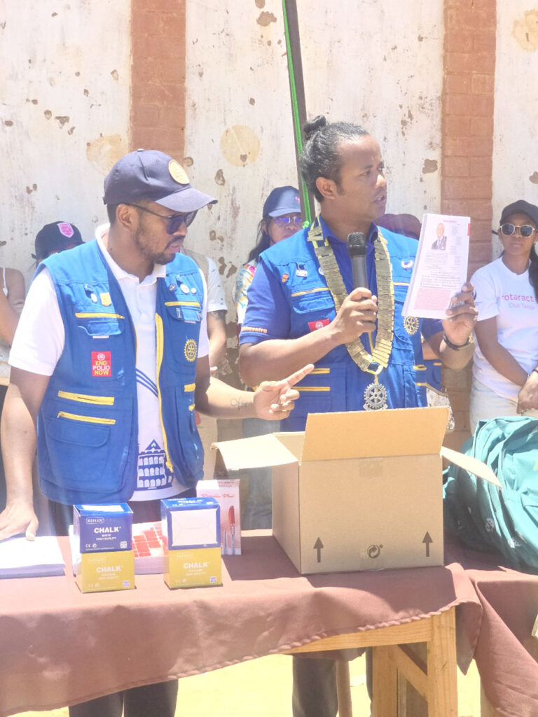 En partenariat avec VIVO Energy Madagascar, chaque élève s’est vu remettre un sac à dos contenant des fournitures scolaires. L’action a également porté sur le renforcement des matériels pédagogiques des instituteurs. Entre autres, des supports pour la préparation des examens tels que des sujets types et corrigés 2024, des cahiers de préparation de cours, des stylos rouges et des boîtes de craies. Des outils servant à améliorer la qualité de l’enseignement en cette année cruciale pour les élèves. Par ailleurs, le Président de ce club, Ranarivelo Njakarinala, a fait un geste pour apporter un moment de bon enfant et de réconfort en offrant aux 80 bénéficiaires des trois écoles des laits en briquettes et des biscuits dans un élan de partage.