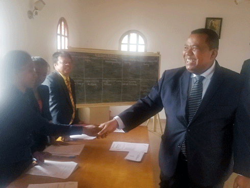 Le ministre Maharante Jean De Dieu saluant hier à Anosy ses collègues magistrats après avoir inséré son bulletin de vote dans l’urne transparente.