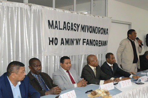 Opposition. De son côté, l’opposition ne va plus en ordre dispersé, elle commence, en effet, à se regrouper. Elle a ainsi mis en place le « Malagasy Mivondrona ho amin’ny Fanorenana » (MMF) ou « rassemblement des citoyens pour la refondation nationale » pour mieux faire entendre sa voix. Le grand rassemblement de l’opposition est composé notamment du « Dinika ho Fanavotam-pirenena » (DFP), « Mitsangàna ry Malagasy », « Rodoben’ny Malagasy ho amin’ny Fanovana Ifotony » (RMFI), CRN et Front de l’opposition. Cette plateforme persiste notamment quant à la démission du Président de la République.