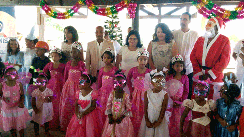 Les dirigeants de l’OMNIS et de l’AFO, avec les enfants qui ont réalisé un petit spectacle de noël, au Batou Beach.