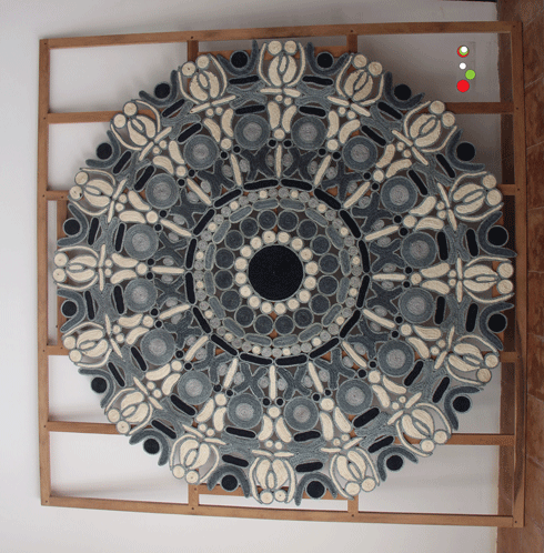 PV :En tant que designer, depuis 30 ans, j’ai toujours été fascinée et travaillé les « symboles archétypaux ». Ils touchent notre inconscient collectif et créent une forme de langage commun à tous les hommes. Mon premier tapis fût bien sûr un Mandala, forme géométrique se retrouvant dans toutes les cultures du monde entier. Notre œil ne se pose pas, notre esprit non plus et permet de s’évader comme du fait de regarder un feu et ses mouvements perpétuels. Notre inconscient s’éveille.J’aime aussi le travail des formes aléatoires recherchant l’équilibre dans l’amoncellement de celles-ci, rien n’est précis et pourtant, notre vision perçoit la stabilité de l’ensemble. Mes tapis débordent de leur cadre, sont percés par endroit laissant apparaître le sol où les murs leur conférant un peu plus de matière.
