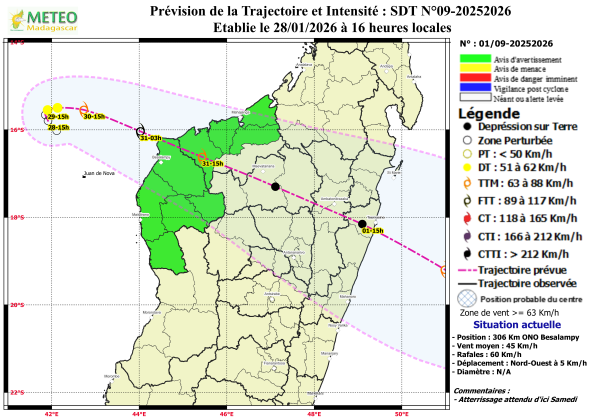 La perturbation cyclonique en cours de formation dans le canal du Mozambique mérite déjà une vigilance renforcée de la part des populations d’au moins deux régions des axes Ouest et Nord-Ouest de Madagascar. Selon Météo Madagascar, le centre de ce système était positionné, hier à 15 heures, à environ 306 km à l’Ouest-Nord-Ouest de Besalampy, avec un vent moyen estimé à 45 km/h et des rafales de 60 km/h sous orage. Depuis hier matin jusqu’en milieu d’après-midi, il est resté quasi stationnaire. Au vu des conditions atmosphériques et océaniques plutôt favorables à une intensification, ce système tend vers une évolution progressive vers un stade de tempête tropicale, probablement dans la journée de demain, vendredi 30 janvier 2026. Selon toujours Météo Madagascar, au regard des tendances des données analysées, ce système menace directement les régions du Nord-Ouest à compter du samedi 31 janvier à l’aube. Il traversera probablement le pays d’Ouest en Est durant le week-end.