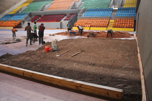 Les premiers travaux de revêtement en terre battue du parquet du Palais des Sports ont commencé hier. (Photo PNCS)