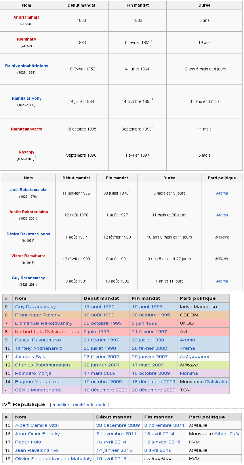 Depuis la royauté jusqu’à nos jours, Madagascar a connu 27 Premiers ministres (voir tableau par ailleurs). C’est du temps de la royauté que l’on assiste à un record de longévité au poste de Premier ministre. Rainilaiarivony vient en tête avec 31 ans et 3 mois (1828-1896) à la Primature. En seconde position, Rainivoninahitriniony qui a assumé le poste de Premier ministre durant 12 ans et 5 mois. Notons que du temps de la Ire République, il n’y avait pas eu de Premier ministre. De la IIe République jusqu’à la IV e actuellement, c’est Désiré Rakotoarijaona qui détient le record, il a siégé 10 ans et 6 mois à Mahazoarivo. A la quatrième place Tantely Andrianarivo, 3 ans et 7 mois (23 juillet 1998-26 février 2002) et pour la cinquième place, Victor Ramahatra, 3ans et 5 mois en tant que Premier ministre.