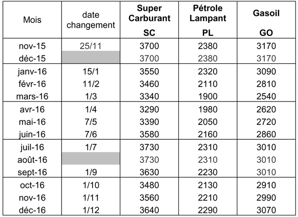 Une augmentation des prix cette fois-ci encore, puisque la vérité des prix veut que la variation à la baisse ou à la hausse soit indexée aux deux paramètres essentiels que sont les prix du brut et la parité de l’ariary. Les cours du brut est passé de 50 dollars en début décembre à 55 dollars actuellement. Cette remontée des cours du brut provient, rappelons-le, de l’accord historique signé entre les pays membres de l’OPEP, pour une limitation de leur production. Pour sa part, le dollar s’est envolé, non seulement par rapport à l’euro, mais également, par rapport à l’ariary. Le dollar est ainsi passé de 3 329,16 ariary au début à 3 350,54 ariary actuellement. Deux changements à la hausse suffisants pour réviser les prix à la pompe. Pour rappel les prix actuels sont de 3 640 ariary le litre pour le super carburant, 2 290 ariary pour celui du pétrole lampant et enfin 3 070 ariary pour le gas-oil. Normalement la hausse qui sera appliquée sera comprise entre 2% et 4%, soit environ 80 ariary par litre.