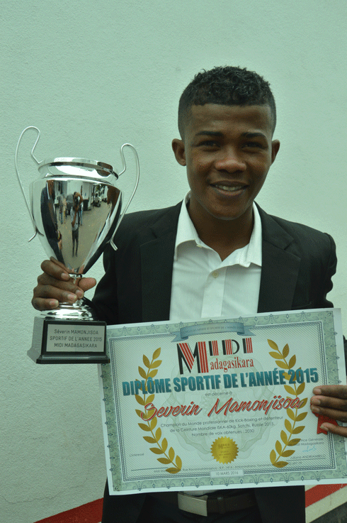 Il a l’un des plus prestigieux palmarès du kickboxing en particulier, voire du sport malgache en général. En 2015, il a fait parler de lui à Sotchi, Russie en remportant la ceinture mondiale ISKA et le titre de champion du monde professionnel. Et les sacres se suivent et ne se ressemblent pas pour Séverin Mamonjisoa. Elu par les lecteurs de Midi Madagasikara comme sportif de l’année 2015, le jeune kickboxeur âgé de 21 ans, a reçu son trophée et le certificat de reconnaissance, hier, au siège du journal à Ankorondrano des mains du Rédacteur en Chef, Patrice Rabe et de la Rédactrice en Chef Adjointe, Hanitra Ramahatra. « Je suis très heureux et fier de recevoir cette récompense des lecteurs. Cela nous motive à toujours exceller davantage dans notre parcours » a lancé Séverin, plus heureux que jamais. Le champion a été accompagné du président de la fédération malgache de kickboxing et disciplines associées, Briand Andrianirina et du président de la Réunion, Jean Bernard Sautron. « Nous remercions Midi Madagasikara d’avoir organisé ce concours pour primer les meilleurs sportifs qui ont marqué la saison. Le kickboxing a prouvé qu’elle est une discipline très prometteuse pour la Grande Ile et comme dit l’adage, jamais deux sans trois, on va rééditer l’exploit en 2017 » déclare, Briand Andrianirina. Les lecteurs qui ont trouvé les bonnes réponses ont reçu également leur part de récompense.