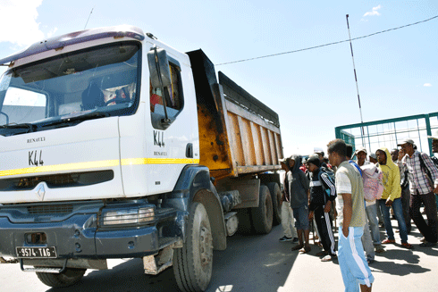 Le camion à benne basculante servant à ramasser les ordures face aux manifestants. (Photo Yvon RAM)