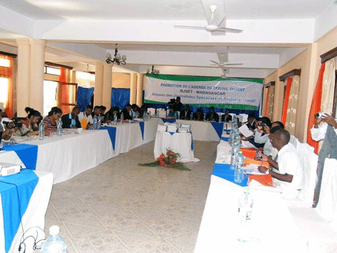 Objectif. Comme l’a expliqué le représentant résident de l’OIT à Madagascar, Ntsay Christian, cet atelier a eu comme objectif principal de renforcer davantage les capacités des journalistes par rapport aux objectifs et programmes de l’Organisation Internationale du Travail (OIT) et spécifiquement dans la mise à jour des connaissances des journalistes membres du RJSET sur les engagements et les programmes de l’OIT, le partage d’expériences des membres du RJSET dans l’appui à la promotion de l’agenda du travail décent dans leurs localités respectives, le renforcement des liens de travail et de la communication entre les membres du RJSET dans les différentes régions.