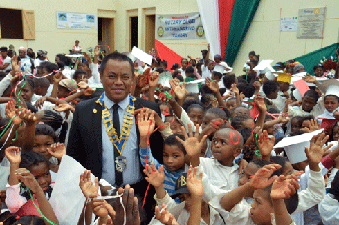 L’heure était à la fête vendredi dernier, dernier jour d’école, mais une grande nouvelle pour tous les élèves et le personnel de l’EPP Ivandry. Après 3 ans d’effort, le Rotary Club Ivandry leur a donné les clés des 3 salles de classe flambant neuves, fruits de la contribution massive du past district gouverneur Vijay Patel, du couple Pala, de diverses entreprises mais aussi du club. Coût de la construction: 110 millions d’ar. Le Ministère de l’Education Nationale en a profité pour se joindre à cet élan d’effort et donner des tables-bancs. Les quelques 600 élèves de cette école pourront désormais étudier dans un environnement convenable. « Les projets ne s’arrêteront pas là » explique le président du Rotary Club Ivandry, Mandimby Rajerisoa Rasata. « En 2016, nous aimerions doter l’école d’une bibliothèque. Nous entamerons également le programme cantine scolaire pour ces enfants, et les meilleurs élèves pourront être parrainés pour leur donner les meilleures chances de réussir ». Lors de cette inauguration officielle, les enseignants de l’école ont reçu leurs distinctions honorifiques. Et en cette veille de Noël, entre deux pas de danse, le club a donné des friandises et des biscuits aux élèves!
