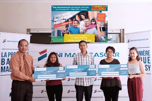 La tombola organisée par la BNI Madagascar lors du Salon International de l’Habitat 2017 a fait trois heureux gagnants. Le premier lot est revenu à Ramamonjisoa Kanto qui a eu droit à un bon d’achat d’une valeur de 400 000 Ar chez Sanifer. José Ravelomanantsoa et Elinah Randrianarison ont respectivement gagné un bon d’achat de 200 000 Ar chez Ballou et un bon d’achat de 100 000 Ar chez Dom’Eau. Les trois heureux gagnants ont récupéré leur lot jeudi dernier des mains de Ndrina Ralaimanisa, directeur de la Communication institutionnelle et des Relations Publiques de BNI Madagasikara.
