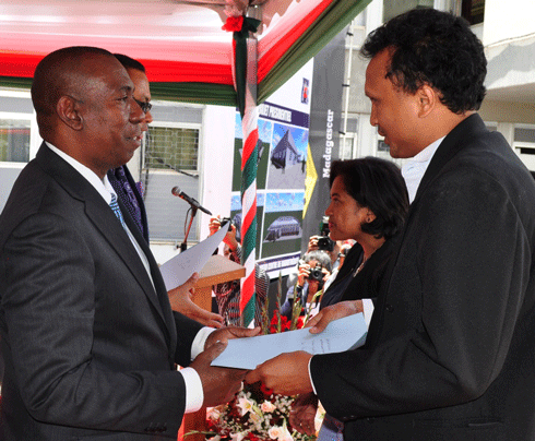 Le Premier ministre Olivier Mahafaly remettant les billets d’avion à des médecins boursiers.