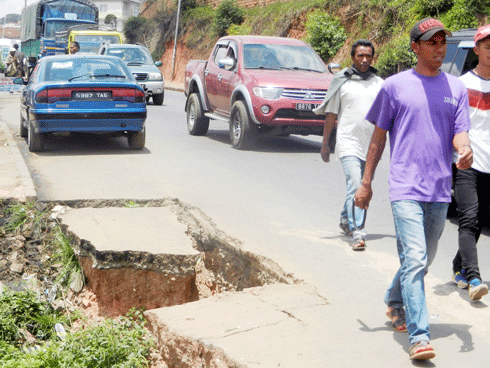 Juste en face de l’ex-garage Mikoja à Nanisana, le coté droit de la chaussée s’affaisse. Le gros trou qui fait presque 10m semble s’élargir de jour en jour. Peut-être qu’il faudra qu’un accident s’y produise pour que les autorités compétentes procèdent aux réparations. Pourtant, de temps en temps, l’on remarque des poids lourds ramasseurs d’ordures du Samva fréquentant ledit garage, stationner de ce coté de la route. Ceci, malgré le fait que la route en question peut s’effondrer en un clin d’œil. Comme si ce n’était pas suffisant que d’autres véhicules des particuliers s’y ajoutent aussi. Personne ne semble avoir conscience du danger que représente ce trou. Des gros trous partout, des affaissements et éboulements ici et là à Tana.