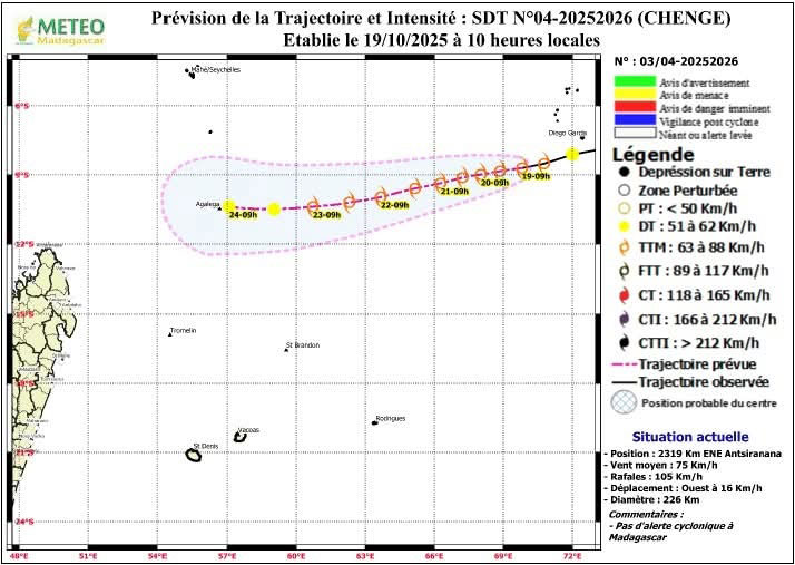 Le système actuellement en évolution dans le bassin Sud-Ouest de l’Océan Indien a été baptisé Chenge, hier. La tempête poursuit sa trajectoire à une vitesse moyenne de 16 km/h et a atteint le stade de tempête tropicale modérée. Elle génère des vents d’environ 75 km/h, avec des rafales pouvant atteindre 105 km/h. Le centre de la tempête se situait à environ 2 319 km à l’est-nord-est d’Antsiranana, vers 9 heures locales, hier.