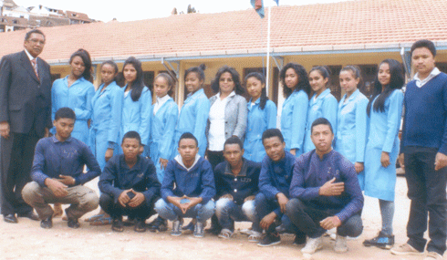 Les acteurs en herbe du lycée Rabearivelo avec le Président de la FMTM, Mbato Ravaloson.