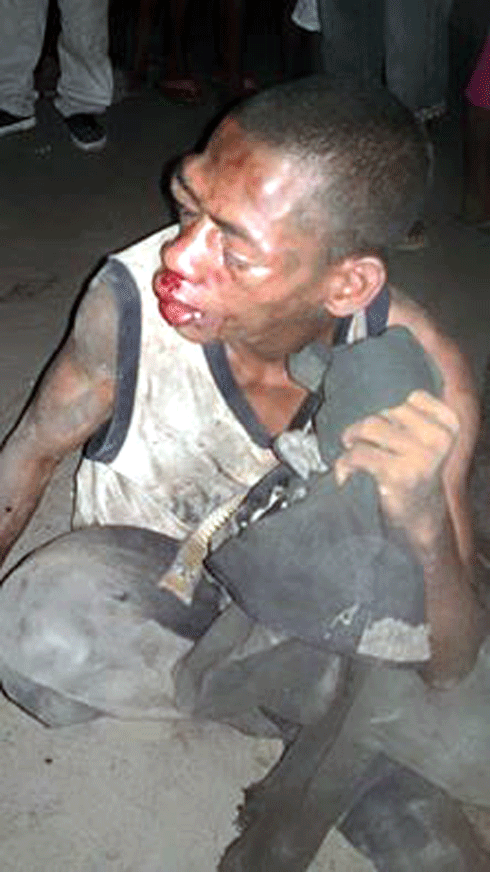 Voasambotry ny olona rehefa avy nanao sinto-mahery omaly alina ho tamin’ny sivy ora sy sasany ka niharan’ny fitsaram-bahoaka avy hatrany ity tovolahy ity sy ny namany iray. Voa mafy ary saika tsy fantatra intsony ny tarehiny araka izay hitantsika amin’ny sary izao.