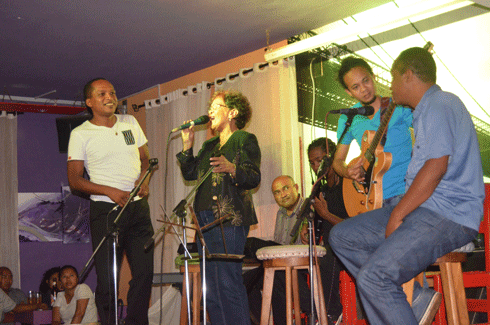 Récréation. Comme dans le temps du lycée où on était quelques amis qui se partageaient la même passion pour la musique, qu’on cotisait pour entrer en studio pour passer le temps et revisiter les titres de ces artistes qu’on affectionnait particulièrement, les artistes à l’affiche du Trass, ce vendredi là, ne jouaient, pas seulement pour le public mais pour leur propre plaisir. Et puis, ce soir-là, il n’y avait pas tellement de musiciens attitrés. Tous savouraient cet instant où le temps d’une soirée, ils pouvaient sortir de leur « bulle ». Ce fut avec joie qu’on retrouva alors Mahery sur scène entouré de Silo au clavier, Nali à la batterie, Jovin et Luk aux guitares. Aimant particulièrement s’entourer des jeunes, « Maman » était, quant à elle, accompagnée de Benkheli à la guitare, Harty Andriambelo à la basse, Dasy à la batterie et Rivokely au clavier. Bref, ce fut un moment unique où l’on avait plus l’impression d’être dans une cours de récréation qu’ailleurs.