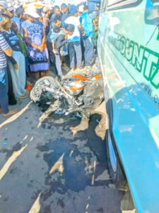 Un tragique accident de la circulation s’est produit hier matin sur la route du By Pass, non loin de l’Espace Rose. Une moto est entrée en collision avec un véhicule de transport circulant en sens inverse. Le choc, d’une extrême violence, a coûté la vie au conducteur du deux-roues, mort sur le coup. Selon les témoins présents sur les lieux, les deux véhicules roulaient à vive allure au moment de l’accident. C’est dans cette portion de route en ligne droite que la moto et le véhicule se sont percutés de plein fouet. Sous la force de l’impact, la moto a été complètement broyée et s’est retrouvée coincée sous le véhicule. Les éléments des forces de l’ordre se sont rapidement rendus sur place pour réguler la circulation et constater les faits. Une enquête a été ouverte afin de déterminer les circonstances exactes de l’accident, notamment la vitesse des deux véhicules et une éventuelle imprudence de l’un des conducteurs. Ce drame rappelle, une fois de plus, la nécessité d’une vigilance accrue sur cette portion du By Pass, souvent théâtre d’accidents liés à l’excès de vitesse.